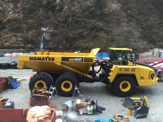 線路沿いの工事現場の大型トラック 分解してトロッコ電車で運んで来て、現場で組み立てる。 丁度、このトラックが組立中らしい。 トラック代(7,000万円)に、運搬・組立費(3,000万円) このトラック 1台(1億円)だそうだ。 |