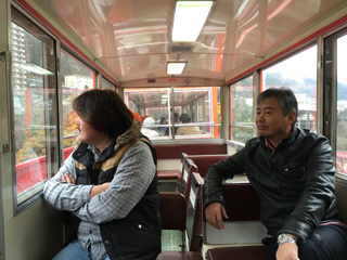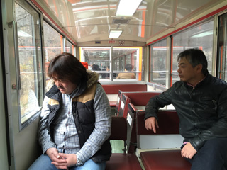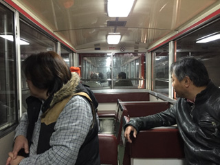 この車両の客は我々だけで、貸切車両って感じだ。 しかも、ガイドの車掌さんも乗っている。 |