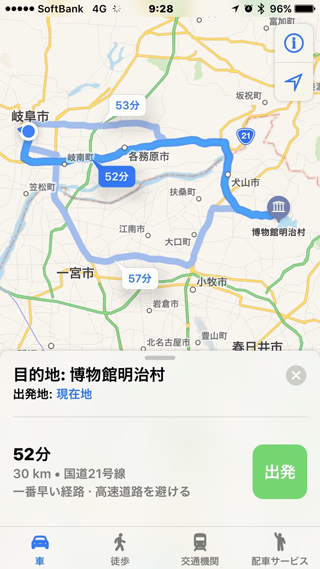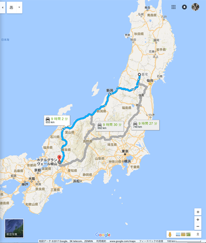 山形から岐阜まで車で行くと、北陸自動車道と東海北陸自動車道経由で 655km(9時間2分)らしい。