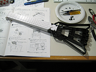 ピックアップと電源部分、残りのパーツを取付けて完成! ネジが 1個余ったんですけど・・・、まあイイや。 学研マーク入りの「特製ピック」も付いてます。 |