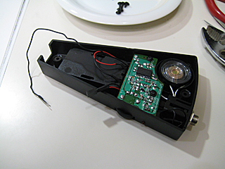 電源部分の組立て完了! 内臓アンプとスピーカーの電源は単三電池(2本) ニョロっと出てるのはアースです。 |