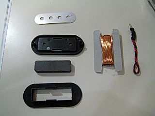 ピックアップのパーツ コイル線を 180回くらい巻いて、両端をリード線に繋ぐ。 磁石を入れてシールで蓋をする。 ピックアップの組立てが一番面倒な作業かな? |