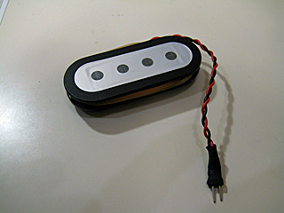ピックアップ完成! ピックアップって、磁石を銅線で巻いただけなんですね。 弦の振動を、電磁誘導で電気の波に変換します。 |