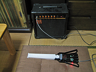 ギターアンプに繋いでみましょう。 バッチリですねえ。綺麗な音が出ます。完璧ですよ。 内臓アンプ&スピーカーの音の方ですけど、 オーバードライブの掛かった「歪んだ音」が出ます。 |