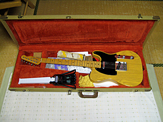 私のテレキャスターと並べてみましょう。 比べると物凄く小さいです。ミニエレキですから・・・ テレキャスターは本物(Fender USA)ですよ。 |