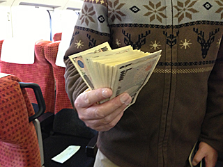 | JR さくらんぼ東根駅で、大類・天野さんが合流 大類くんがおもむろに、小遣いはこれくらいで足りっべが? 小遣いを 50万円持って来たらしい。 困った時は、全てお金で解決します。が彼のモットーだ。 |