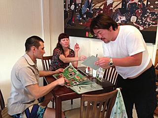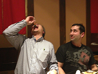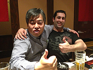 | 当然だが、ジョシュは我々に捕まる。そして一緒に飲む事に・・・ ジョシュも、すっかり我々と意気投合って感じだ。 筋肉モリモリのジョシュだが、腕相撲は大類くんの方が強かったりする。 米国人、日本人をなめんなよ。 |