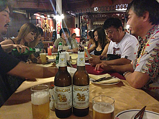プーケットタウンの海鮮料理屋で夕食 タイ航空の機内食はイマイチだった。全部食ったけど・・・ トム・ヤム・クンでも食うか? あれは未だ無理だ。 タイに来たら、先ずは「シンハビール」で乾杯!である。 |