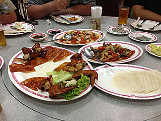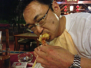 | プーケットタウンの中華料理屋 晩飯を食いに、ガイドのポンちゃんに連れて来られたが、 チンジャオロウスーも、ホイコーローも作れない中華料理屋だった。 酢豚はあったがイマイチ、北京ダックならぬ北京チキン?は旨かった。 それ以上食えなかったので、店を出る。日本人なめんなよ。 |