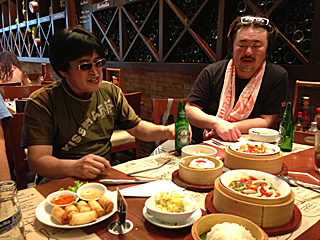 | エビが旨めえ、バクバク食う。 昨日は、山形新幹線でも成田エキスプレスでも怒られたらしいので、 食事は静かに食べましょう。だが、静かに出来る訳が無い。 私は静かだが、大類くんの笑い声が大きい。それだけの話しだ。 |