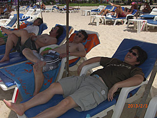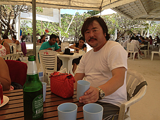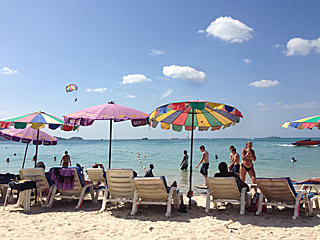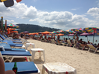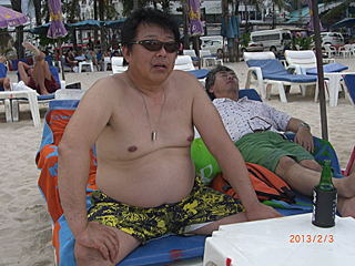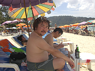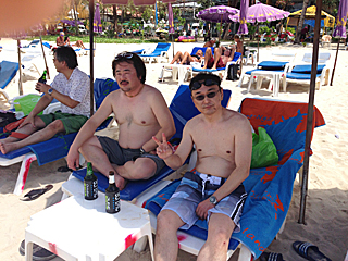 | 老いも若きも、トップレス姿で肌を焼いていたりする。 写真を撮りたい所だが、流石にトップレスを撮るのはマズいだろう。 ジェットスキーに乗れだの、パラセイリングしろだのと、 ビーチのチンピラ・ボーイ達が五月蝿い。お前ら真っ黒だな! 我々は、極力肌を焼きたくないのだよ。日陰でシンハビールが一番さ。 |