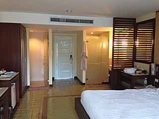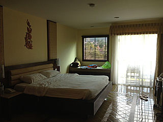 | 私の部屋はこんな感じ・・・ 小さいベランダが付いていて、椅子とテーブルが置いてある。 部屋の中はエアコンで涼しいが、ベランダでビールを飲むのも旨い。 そのエアコンだが音が五月蝿い。夜中に起きると妙に気に成る。 |