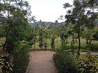 | ホテルの隣りの棟の間は、こんなウチワみたいな木で隔てられている。 4人は 2階の部屋だったが、三浦さんだけ 3階の VIPルームだった。 我々の部屋はシャワーしか無いが、三浦さんの部屋はバスタブ付きだ。 |