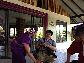 朝食会場の席が混んでいたので、相席させて貰った。 どこの国の娘だろう?バンコク辺りから遊びに来たタイ人か? Photo OK? と言ったら、右の娘は愛想のイイ顔をしてくれたが、 左の娘には完全無視された。右の娘は私に気があるに違いない。 はいはい、ありません。 |