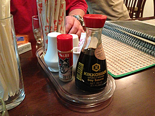 | なぬっ、キッコーマンの醤油があるじゃないか! 七味唐がらしまである。この店は侮れないかも。期待出来るかもよ。 |