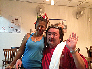 | この人が料理人兼ママさんで、其れなりに日本語も話せる。 ノリのいい憎めないママさんだが、味の方はどうなんだろう? って言うか、寺ちゃんの顔デカっ! |