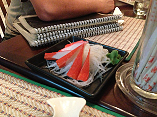 | カニの刺身が出て来た。カニカマだ。笑って許す! ここプーケットに、日本食レストランの穴場を発見したって感じだ。 我々が求めていたのはコレなのだ! 日本人の皆さん「WASABI RESTAURANT」を夜露死苦! 場所は、パトンビーチのザ・ナチュラル・リゾートの近くです。 |
