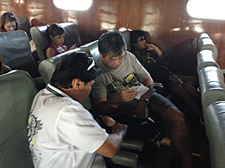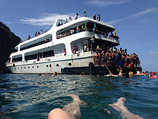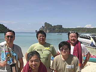 | ピピ・ドン島に到着 未だ上陸はしない。ここでダイビング班とスノーケル班に分かれた。 ダイビング班:大類・天野・三浦(3名) スノーケル班:伊藤・寺崎(2名) なんだ、禁煙チームと喫煙チームじゃないか。 どうりで、寺ちゃんと一緒にいる時間が多かった訳だ。 |
