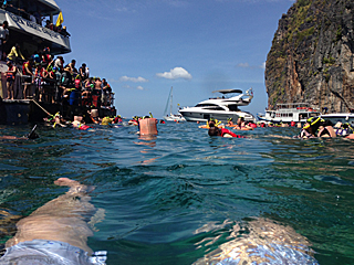 | ピピ・レ島でスノーケリング こんな写真は、iPhone を防水ケースに入れているから撮れた。 持って行った iPhone 用防水ケースの防水性能は完璧だった。 ただし、水中ではタッチ画面が上手く言う事を利かなかった。 ここに来る前に、風呂の中で練習して来るべきだったね。 |