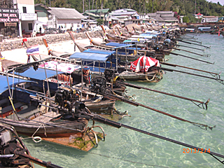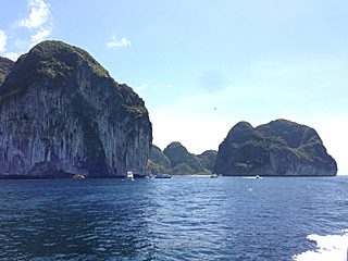 | 今日は映画「ザ・ビーチ」で有名に成った、ピピ島に行く予定だ。 ピピ島と言うが、6つの島から成るピピ諸島が正解だ。 一番大きなピピ・ドン島、ビーチのロケをしたピピ・レ島、その他 4島。 プーケットタウンから、船で 1時間半くらいで行ける。 |