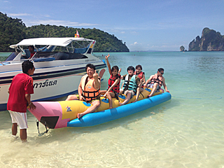 | ビーチでボケっとしていてもつまらん、バナナボートでも乗るか? 男 5人でバナナボートってのもな・・・ 女の娘 4人がバナナボートに乗りたそうにしていた。 タイ人の様だったので、ガイドのポンちゃんに話しさせた。 交渉成立、一緒にバナナボートに乗る事にした。 バナナボートの料金ですか? そんなの我々が出しますよ。 |