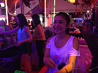 | ゴーゴーバー「タイガー」 我々は、この娘にロックオンした。いや、させられた。 別にお立ち台で踊っていた娘と言う訳ではない。 カウンターの中でお酒を出したり、客とゲームをしたり、 メダルゲームを 3回やったが 3回負けた。1勝負 100バーツ! |