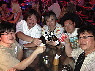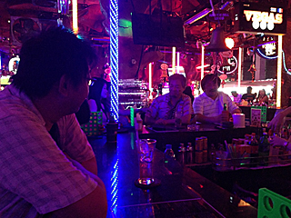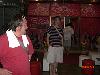 | その後、ガイドのポンちゃんがキャバクラみたいな所に連れて行った。 どうなんだろう?私的にはその店もイマイチって感じ・・・ 一人(大類くん)だけは楽しんでいた様子だった。 ハッキリ言って、ガイドのポンちゃんが連れて行く所は全部ダメだな。 タイ古式マッサージは良かったけど・・・ [Photo by Miura] |