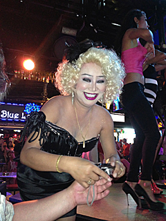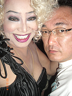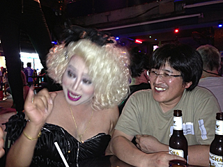 我々が求めていたのはコレだ!そうか?違うだろう。 だが、こんな人を見付けたら、店に入るしかあるまい。 コンパス会は、怖いもの知らずなのだ。 しかも、このマリリン風オバさんは、男だし・・・ ここはオカマバーだったのだ。 そしてマリリン風オバさんは、この店のママさんだった。 |