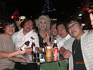 | 皆してワイワイ飲むと、オカマバーも意外に面白い。 しかもママさんが付くと、店の可愛い娘も一緒に付いて来る。 超ベッピンさんだ。男だけど・・・ |