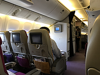 タイ国際航空(エコノミークラス)の機内 ビジネスクラスを我慢して、ホテルのランクを上げるのが基本だ。 どうせ寝て行くだけだし・・・ |