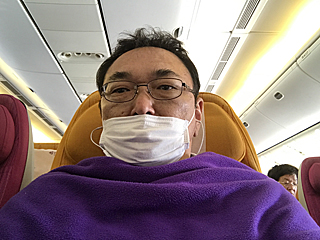 実は、出発 2日前から喉の具合が悪い。 体調万全とは言えなかったのだ。 機内は乾燥して冷えるので、しっかり防寒して寝る。 それでは、おやすみなさい・・・ |