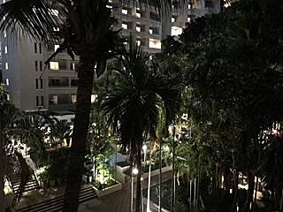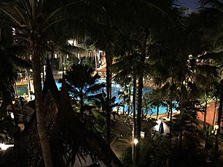 低層棟(Room 423)のベランダから中庭プールを見る。 夜もプールに入れるのだろうか? |