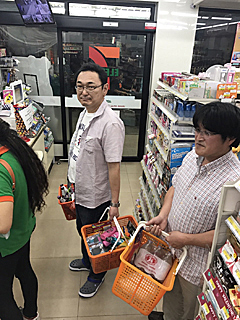 食事の後は、コンビニで「大人買い」です。 何でも買ってイイと言ったら、買い物ワゴン(3つ)ですよ。 半分は我々の酒とつまみだが、半分は彼女たちの日用雑貨品である。 尚、コンビニ男気の勝者も私です。うえ〜い! [Photo by Orui] |