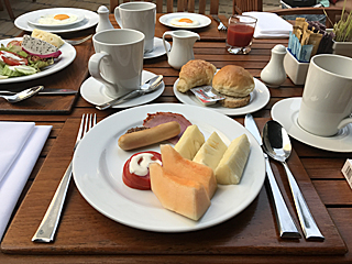 私の朝食は質素です。 パンとコーヒーとフルーツとつまみ、 パイナップルが甘くなかった。ダメだなアバニ・・・ |