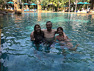 ホテルの中庭プールにて 日本は冬なのに、ここは真夏ですよ。 プールでカクテル飲んで最高だねえ。ジントニックを 3杯飲んだ。 頭に付けているのは、水中メガネ(度付き)です。 |