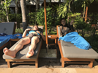 先ずは、皆して「タイ古式マッサージ」です。 オンちゃんもメイちゃんも一緒にどうぞ・・・ マッサージ代は、全て我々の男気で払いますから・・・ 一人 300バーツ、5人で 1,500バーツ(4,840円)です。 因みに、ここの男気は大類さんでした。コップンカッ! |