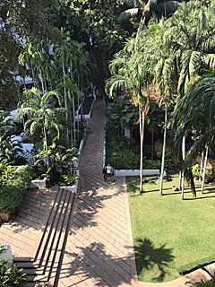昨日の彼女(メイちゃん)がホテルに到着 ちょっと判り難いですが、真ん中の小さい白いのが私です。 その左がメイちゃんで、右が通訳のオンちゃんです。 真ん中の道を真っ直ぐ行くと、フロントへ行けます。 この中庭には鳥だけでなく、リスとかもいます。 [Photo by Orui] |