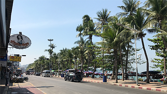 パタヤーのビーチ通り 日本は冬なのに、ここは真夏ですね。 この写真を、パタヤー篇のトップに使いました。 |