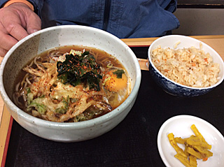 ラーメンを食って帰るつもりだったが、 三浦さんが、どうしても蕎麦が食いたいと言う。 帰る途中で、そば定食を食った。 私は天ぷらそばの大盛りを食った。 |