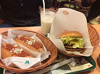 誰かが、モスに寄ってシェイクを飲みたいと言い出した。 モスに寄ったら、今キャンペーン中?らしく、 シェイクに、ハンバーガーとチリドックが付いて来た。 そんなキャンペーンがある訳が無い。嘘だ! 酔っ払って、満腹中枢が麻痺している様である。 |