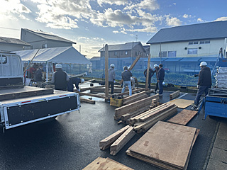 | 模擬上棟式用小屋&もちまきステージ(仮設足場) 組み立てはプロ(大工さん)に任せて、私は材料運搬です。 |