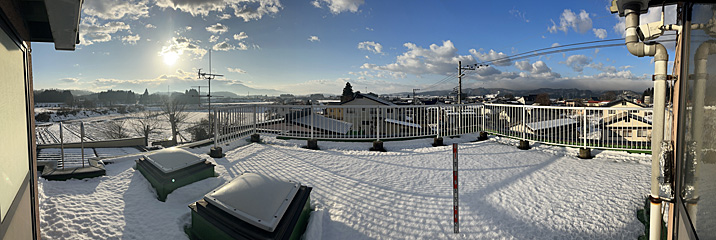 昨日からの雪で、今朝の屋上はこんな感じです。今回の雪は綺麗に融けるでしょうけど、寒く成って来ましたね。