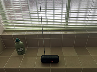 | 念の為、浴室で FM電波の受信状況を確認してみると、 奇跡的に雑音混じりの音楽が聞こえた。だが聞くに堪えない。 防水ラジオのロッドアンテナを目一杯伸ばしての結果です。 車用の FMトランスミッターはダメだな。 こんなにも弱い FM電波とは、予想外も予想外だった。 |