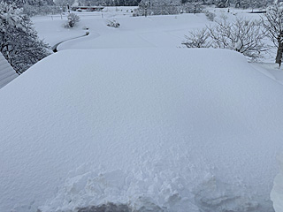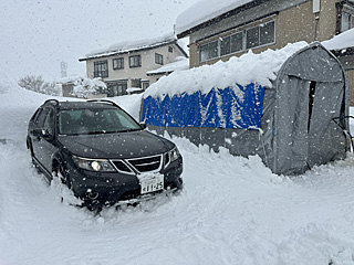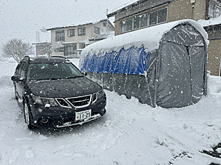 | 雪のリーゼント 車の後ろ側からの強風で、ボンネットに雪が溜まる。 この風なら、パイプ車庫の屋根に雪は積もらない。 |