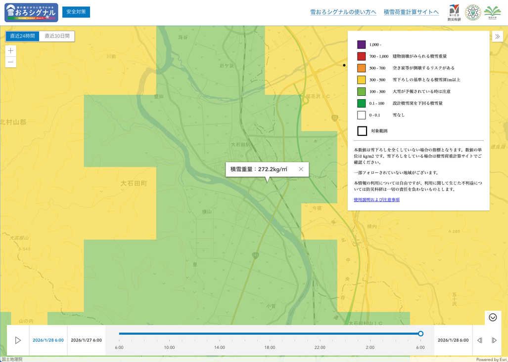 いつもの「大石田町の観測値」と「防災科研の推定値」との比較は以下の通りです。