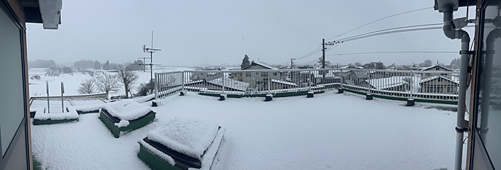 昨日まで無かった雪が、今朝の屋上はこんな感じです。春は近いと思っていましたが、雪はまだ降る様です。