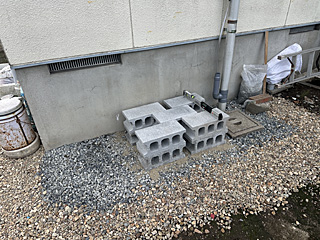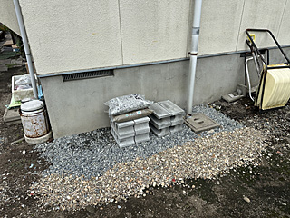 | 雨水タンク設置場所(我が家の南東角) 砂利と砕石を敷いて、地均しをして置きました。 後で砕石に砂で目潰しをして平らな地盤にしましょう。 基礎はブロック(15cm)2段(30cm)の予定です。 この竪樋(VP75)からタンクに雨水を取り込みます。 |