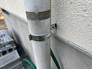 | 竪樋受け金物が錆びてボロボロだったので、新しい金物に交換した。 竪樋の黒い部分が元々の位置で、配管継手の分(85mm)上がった。 VP は VU と違って、肉厚で(丈夫で)イイですね。 こっちは築 38年なので、VU だったらとっくに割れていたでしょう。 |