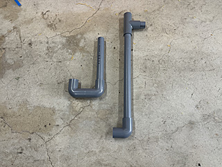 | 竪樋(VP75)を切断しました。 金切鋸で切ったのですが、VP(肉厚)でもサクサク切れました。 切った小口は、布ヤスリ等で整えれば綺麗に成ります。 下にオーバーフローの水を戻す配管継手を追加して、 切ったパイプを更に切って、上に雨水コレクターを付ける。 |