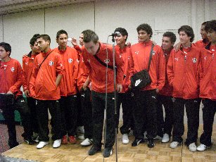 主催者代表で秋保山形東後援会幹事長の挨拶 グスタボ団長と名古屋日大山形校長